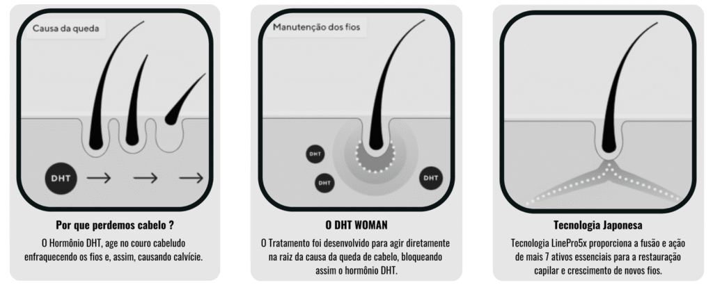 O DHT WOMAN é uma formulação importada Japonesa que contém tudo o que você precisa para restaurar a sua saúde capilar e voltar a crescer cabelos em regiões falhas da cabeça. Ele age bloqueando o hormônio responsável por causar a queda de fios e o adoecimento do couro cabeludo.